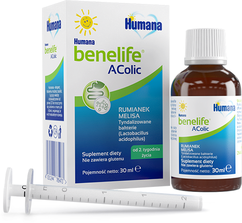 Humana benelife AColic to suplement diety stworzony z myślą o najmłodszych. Formuła oparta o działanie 3 składników przynosi spokój dla brzuszka maluszka!